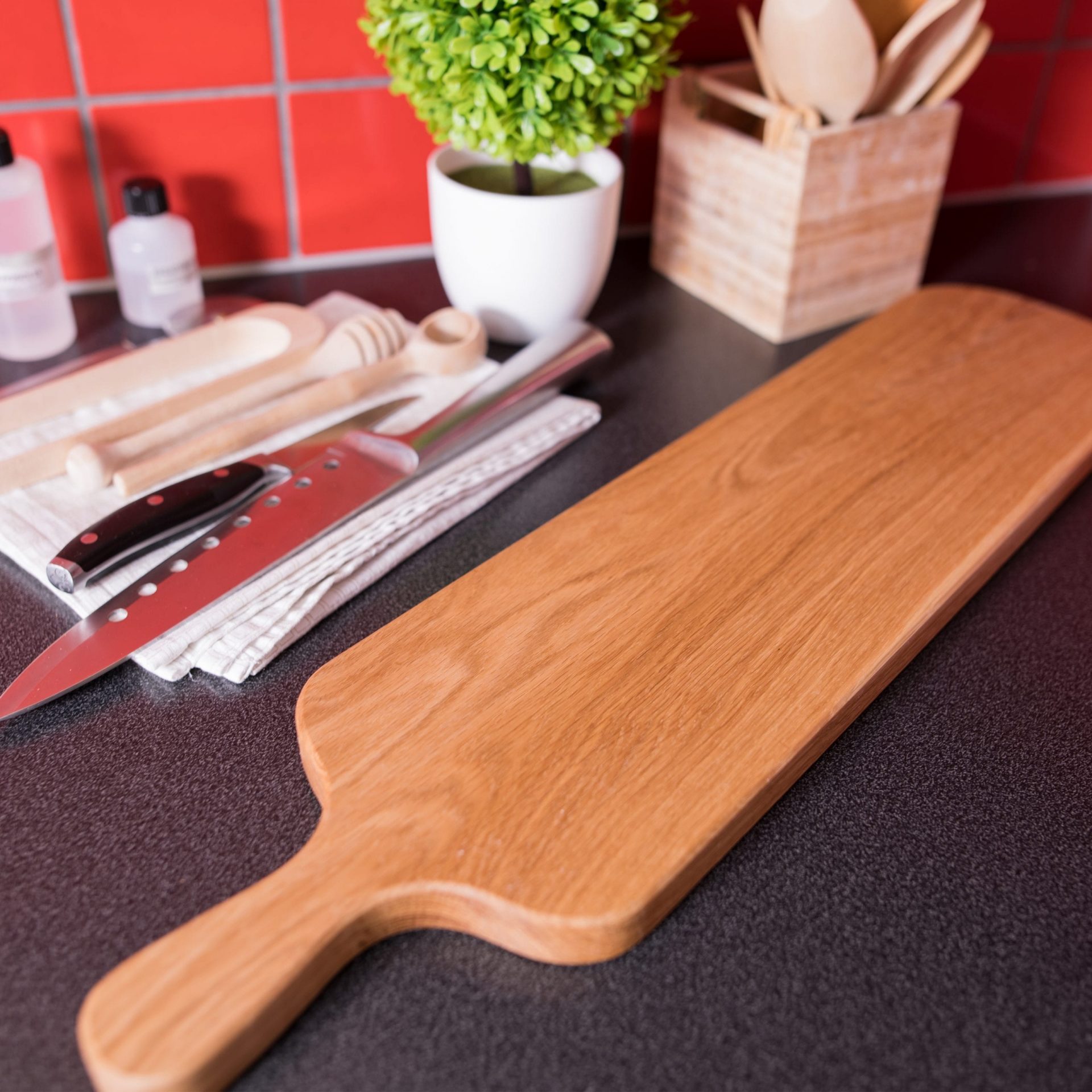 En elegant och mångsidig serveringsbräda i oljad ek, perfekt för tapas, ost, chark eller bröd. Med sin avlånga form och mjukt rundade kanter ger den en stilren presentation vid alla tillfällen – från vardagsmiddag till festdukning. Det välformade handtaget ger ett bra grepp och gör brädan enkel att bära och servera med.