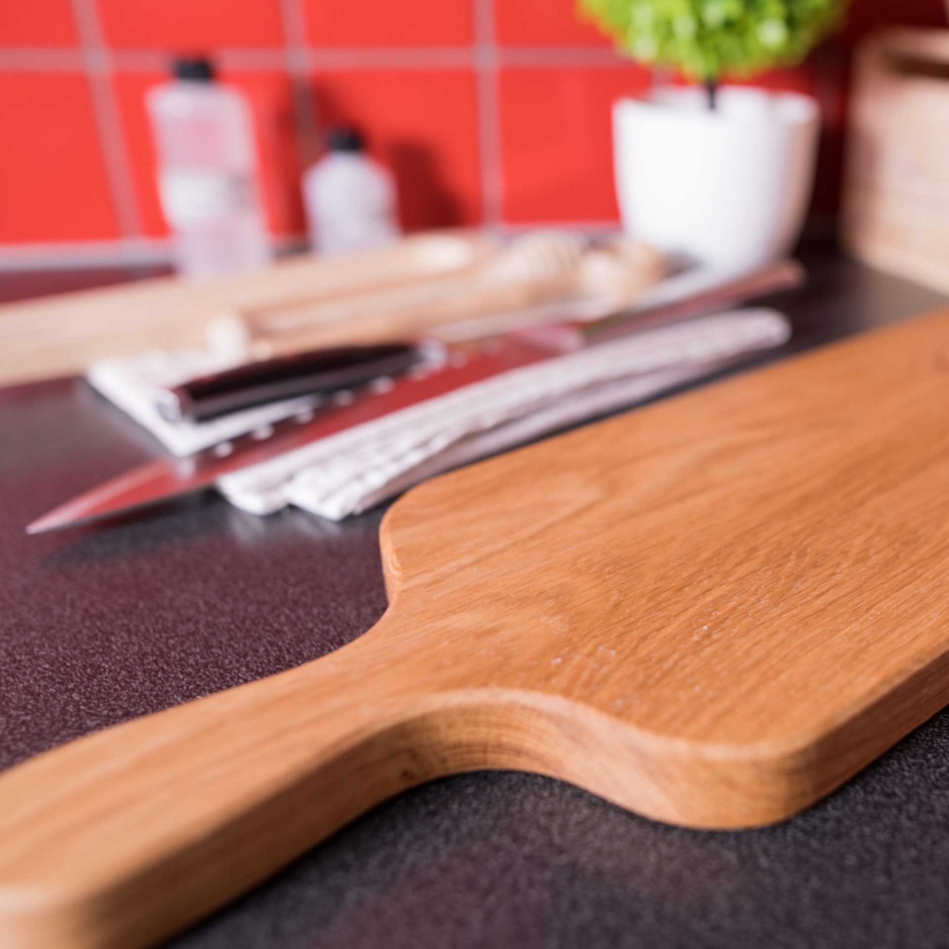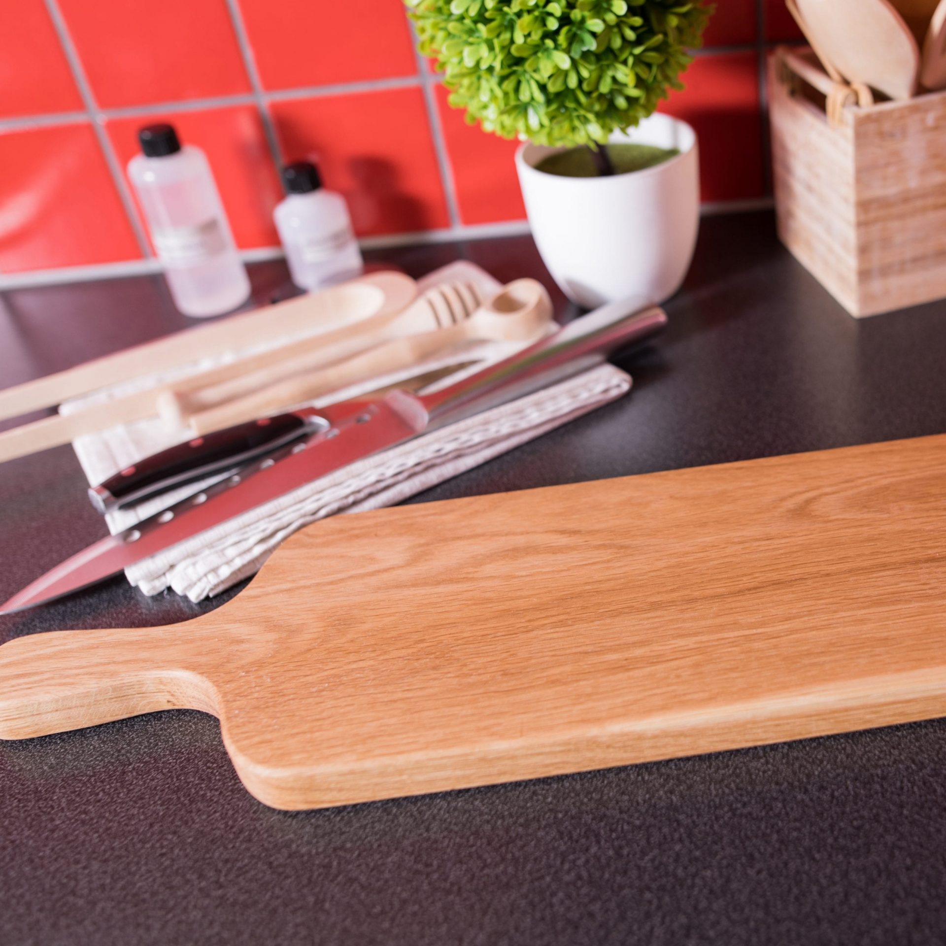 Tillverkad i massiv ek och behandlad med olja för att framhäva träets naturliga ådring och skydda ytan mot slitage och fukt. Varje bräda har sin unika karaktär och blir en vacker detalj i köket eller på serveringsbordet.