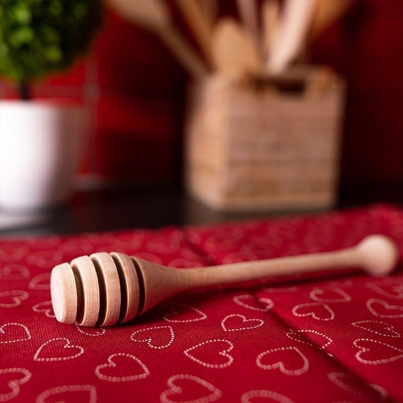 Traditionell honungsrulle i vackert björkträ – perfekt för att ringla honung över yoghurt, ost, te eller rostat bröd. De djupa spåren fångar upp honungen och gör det enkelt att dosera utan kladd. Ett tidlöst och naturligt redskap för den medvetna hemmakocken.