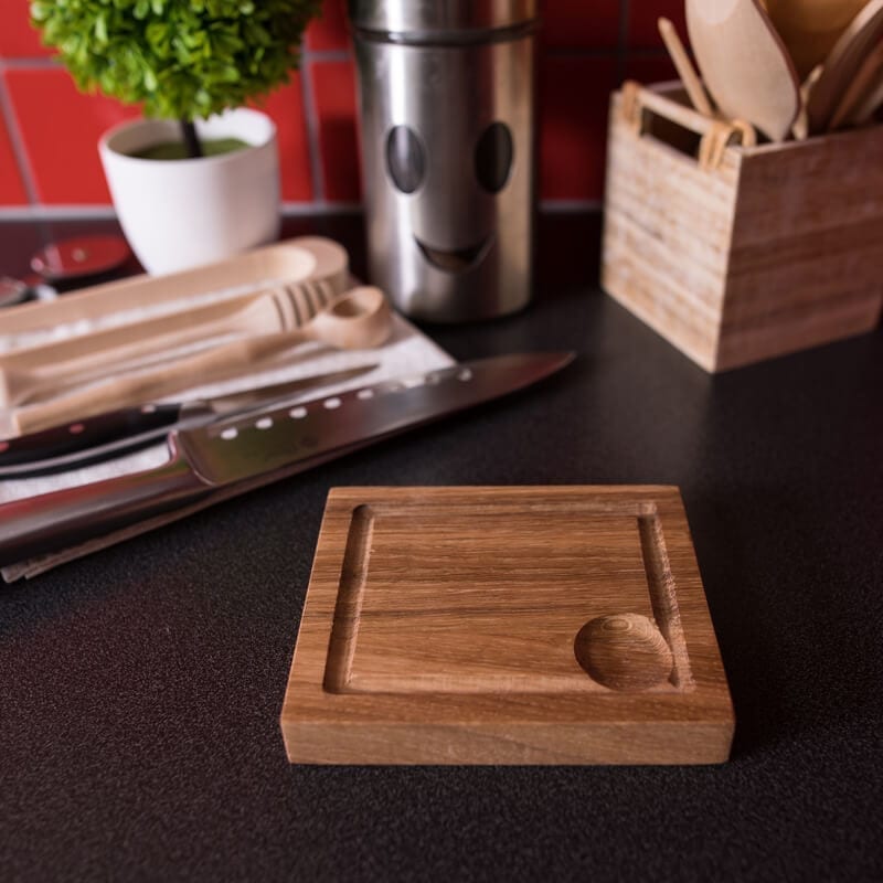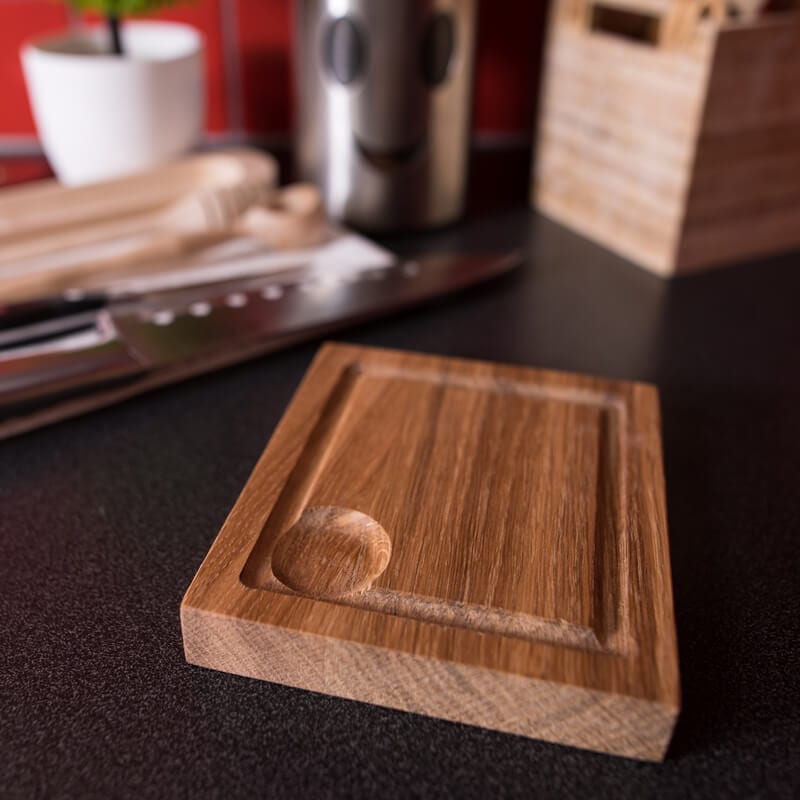En stilren och kompakt planksteksbräda i vackert oljad ek. Perfekt för servering av mindre rätter, tapas eller som en elegant uppläggningsbräda för förrätter och tillbehör. Den inramade spårdesignen hjälper till att hålla vätska och sås på plats.