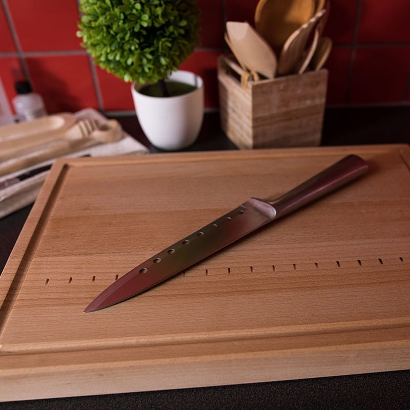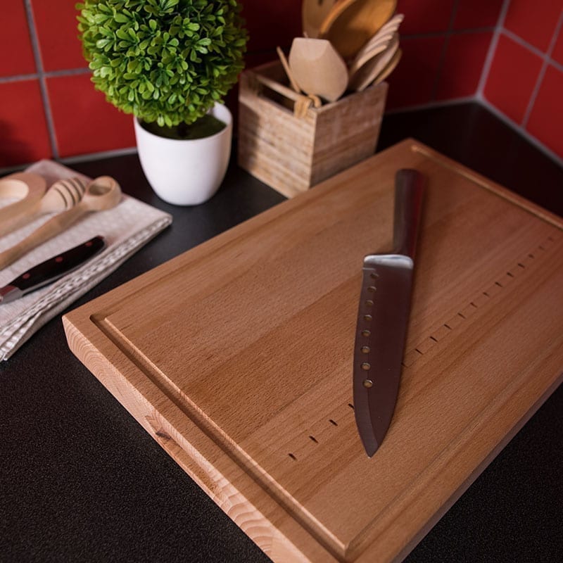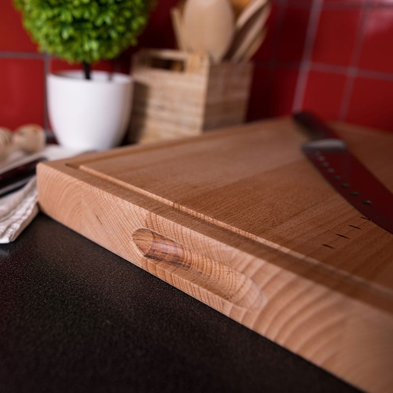 Skärbräda med handtag, spår, mått och oljad – 450x300x40mm