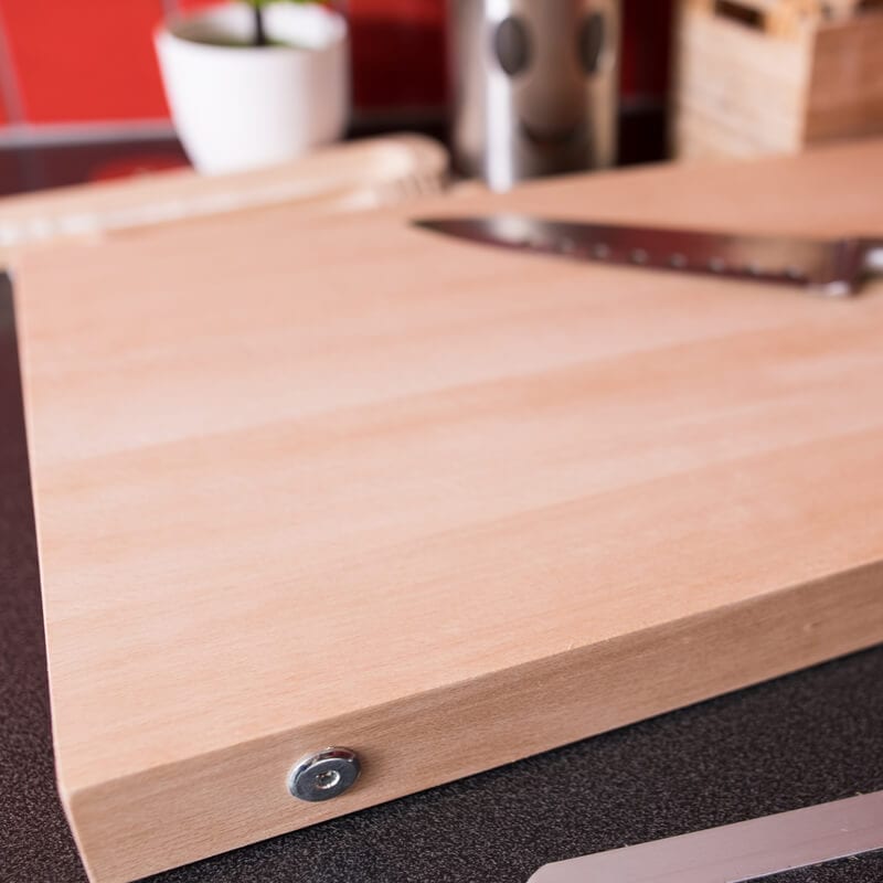 En robust och elegant skärbräda tillverkad i massivt bokträ, perfekt för dig som söker både stil och funktion. Med en imponerande tjocklek på 4 cm ligger den stadigt på köksbänken och klarar av tuffa tag vid köttstyckning eller hackning. Inbyggda bultar på sidorna ger extra stabilitet och skyddar mot sprickbildning över tid. Den naturliga oljade ytan framhäver träets fina struktur och gör brädan både hygienisk och lätt att underhålla. Ett professionellt val för såväl hemmakockar som restaurangkök.