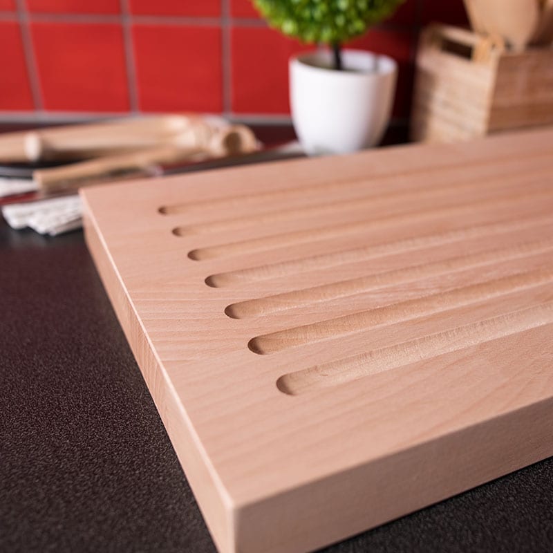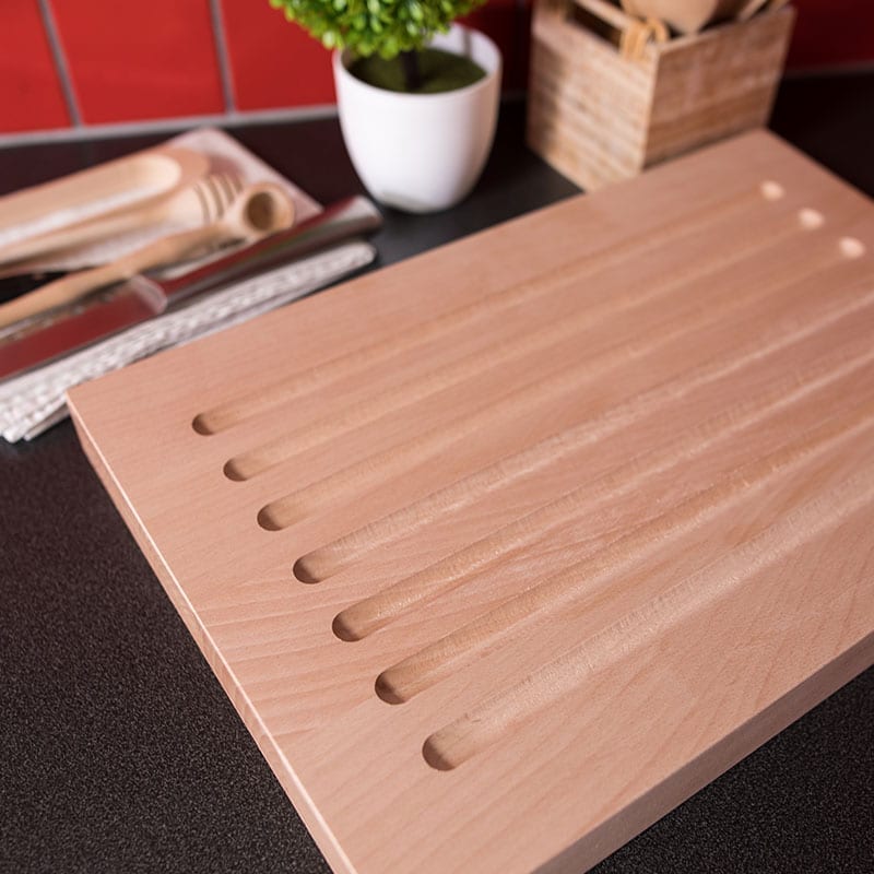 Denna skärbräda i massiv bok är både praktisk och vacker, särskilt framtagen för att hantera bröd på ett smart sätt. De längsgående spåren fångar upp smulor som annars hamnar på bord eller bänk, vilket gör den perfekt vid både frukost och servering. Bokträets ljusa färg och jämna ådring ger brädan ett stilrent uttryck som passar i alla typer av kök.