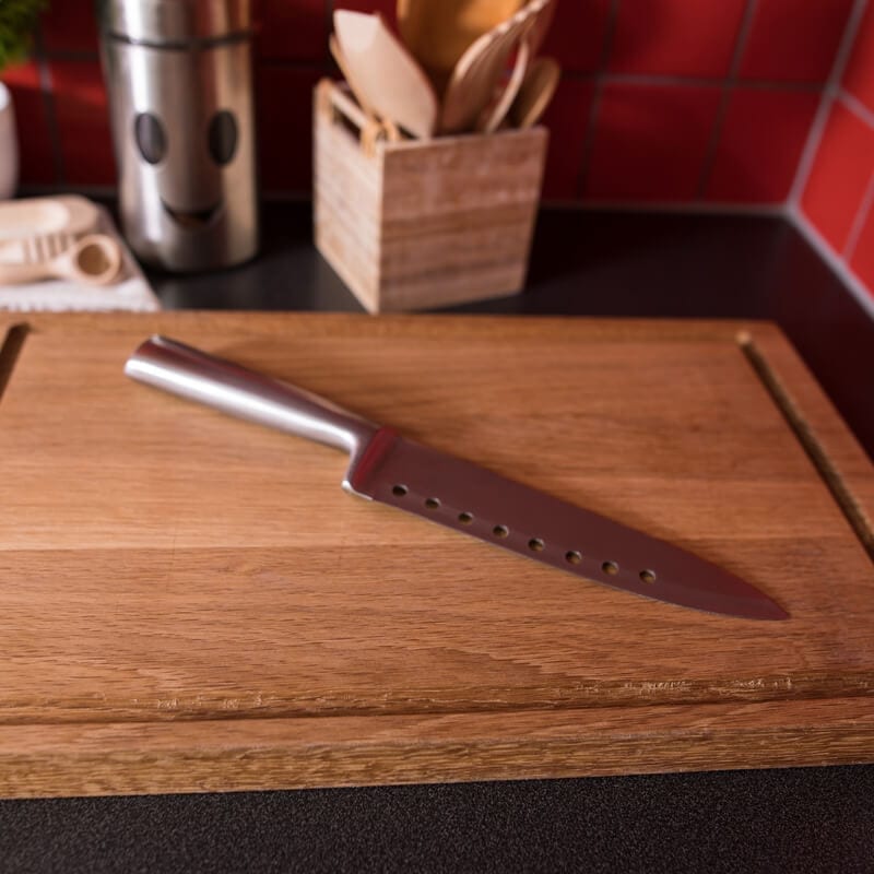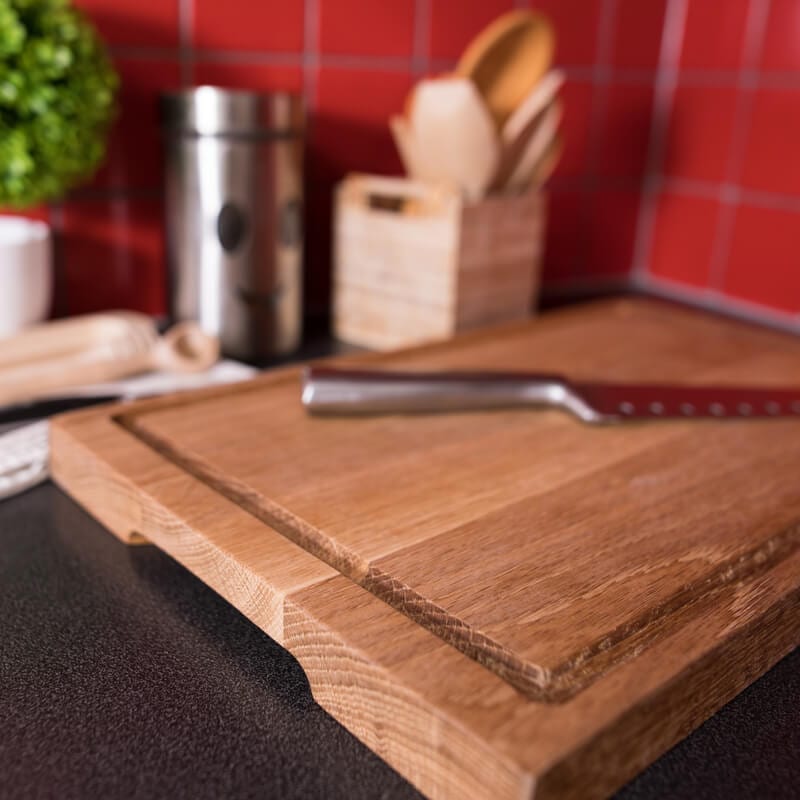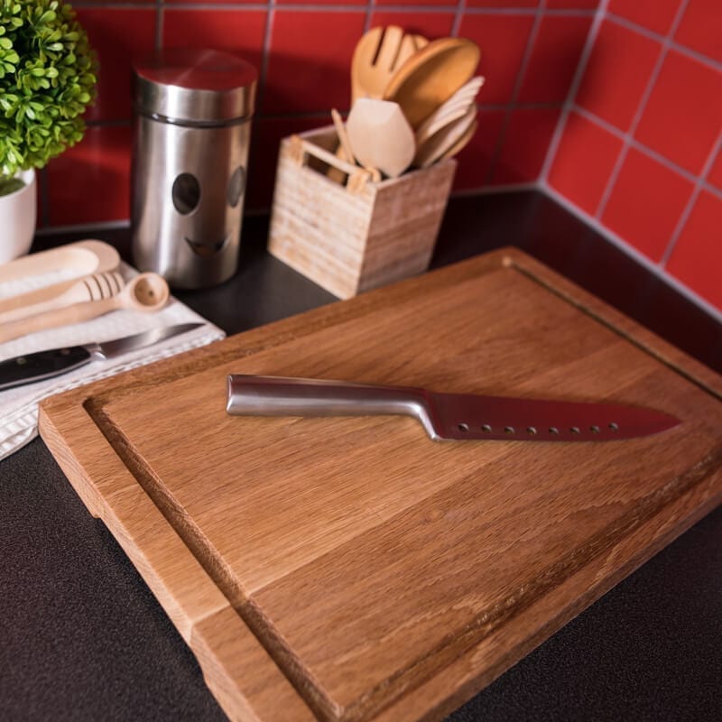 En vacker och funktionell skärbräda tillverkad i massiv ek. Den oljade ytan framhäver träets naturliga ådring och ger ett slitstarkt skydd mot fukt. Det integrerade handtaget gör brädan lätt att lyfta och flytta, medan det frästa spåret längs kanten fångar upp köttsaft eller vätska från grönsaker och frukt – perfekt vid matlagning. Den generösa ytan ger gott om arbetsutrymme och passar lika bra till att hacka grönsaker som att skiva kött eller servera ost och chark.